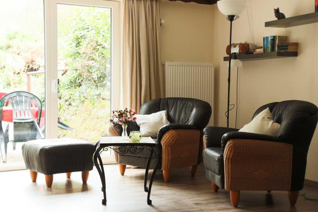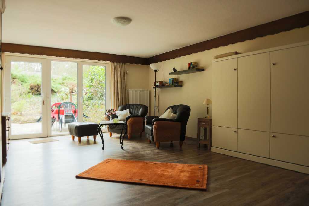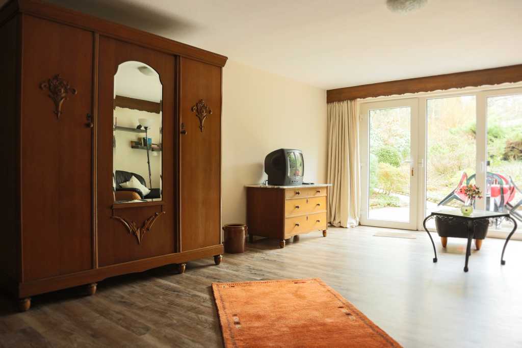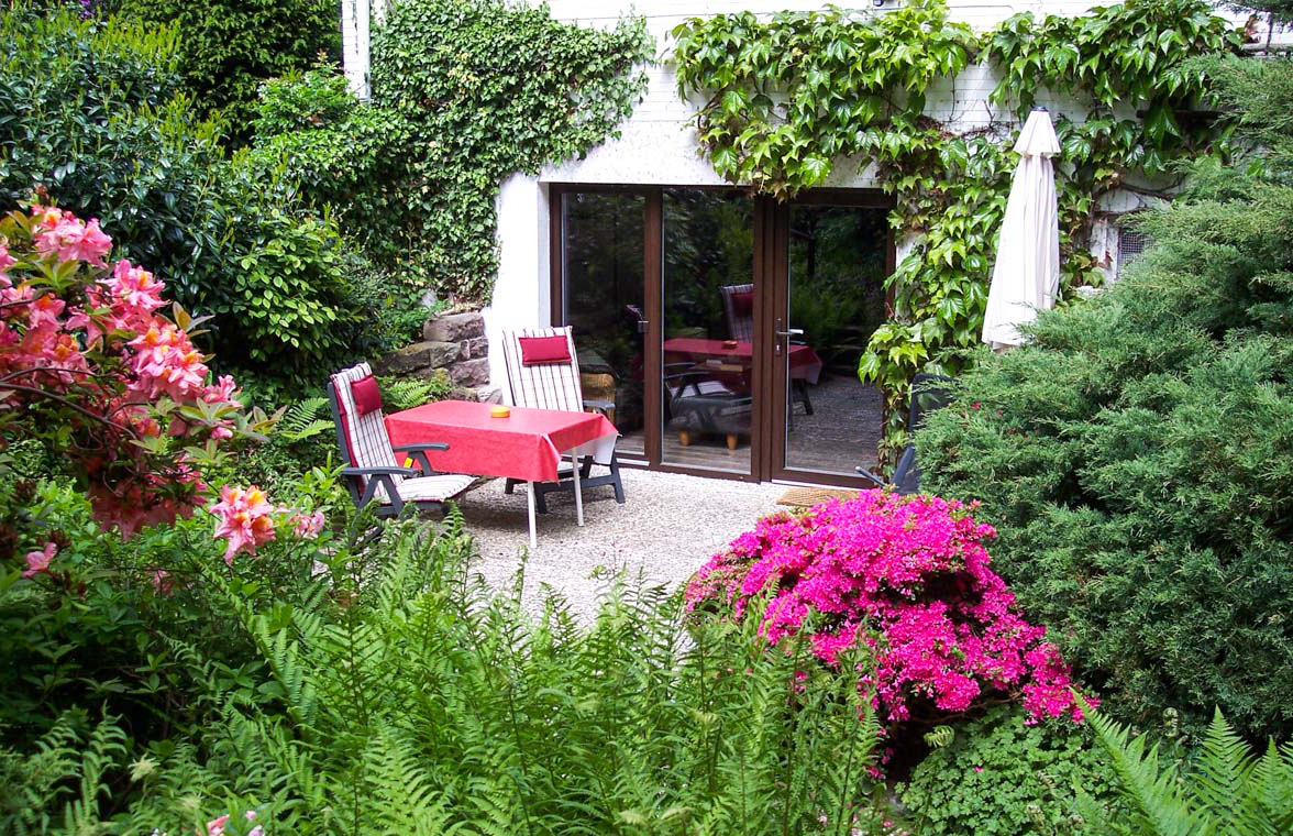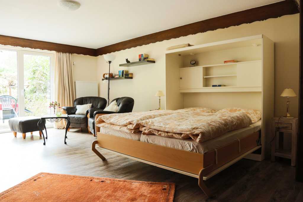 Gemütlich und komplett eingerichtete Ferienwohnung im Souterrain. Der kombinierte Wohn- und Schlafraum mit separater Küche und Dusche/WC bietet auf 35m² Platz für zwei Personen. Auf der Terrasse können unsere Gäste in Ruhe den Tag ausklingen lassen. Parkplätze für Autos und Fahrräder sind vorhanden. Hunde sind ohne Aufpreis erlaubt, Katzen auf Anfrage.
